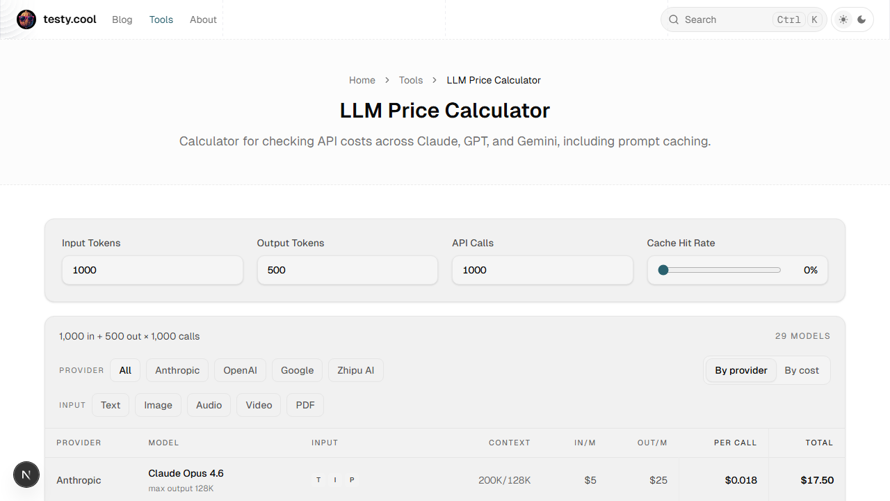 Calculator for checking API costs across Claude, GPT, and Gemini, including prompt caching.