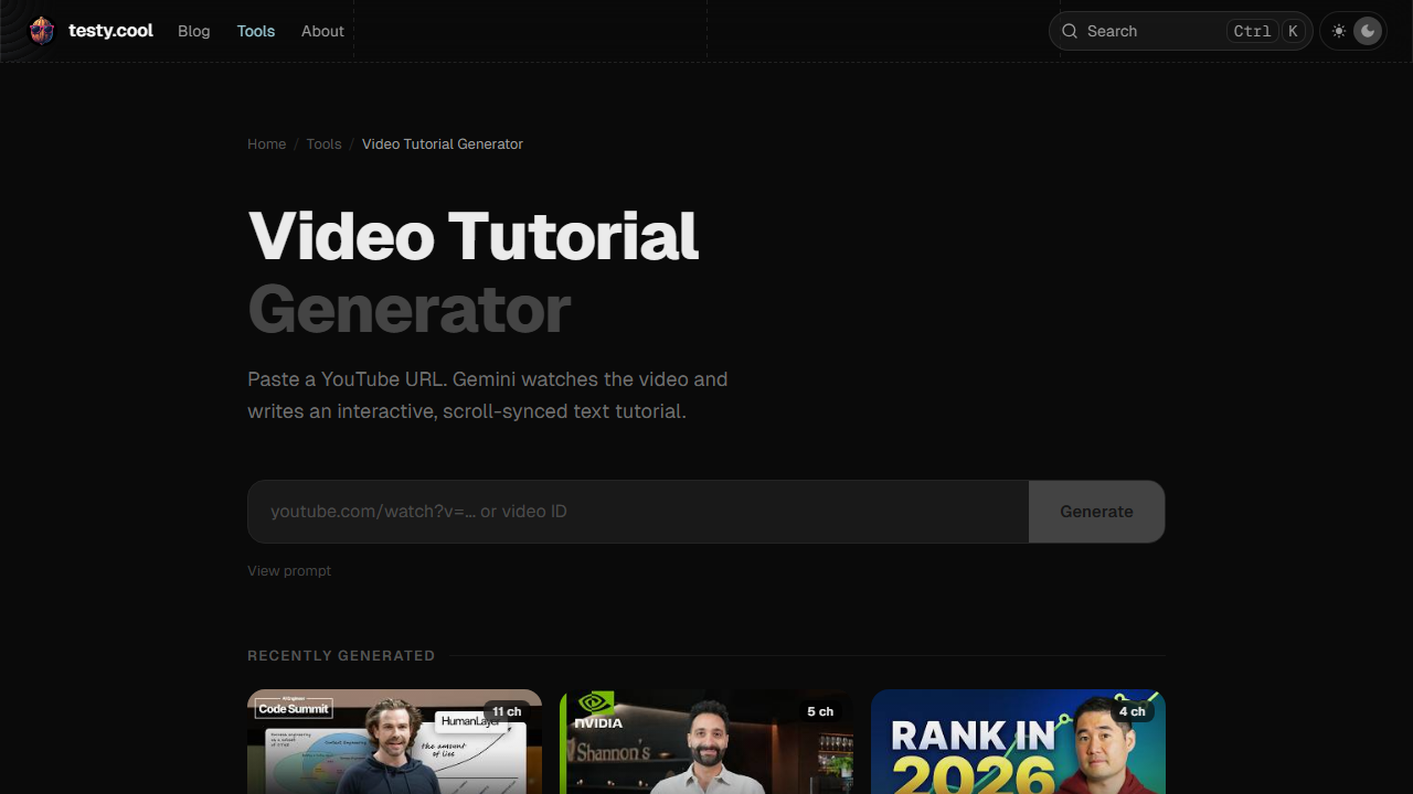 Paste a YouTube URL. AI watches the video and writes a scroll-synced text breakdown.